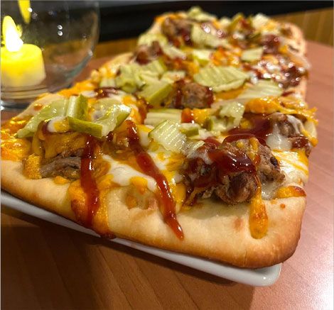 Slow smoked BBQ pulled pork, caramelized onions, cheddar, & mozzarella. Topped w/ diced dill pickles.