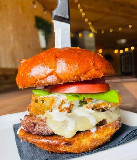 8 oz. ground chuck, brisket & short rib topped w/(2) house made jalapeño poppers, pepper jack, chipotle ranch, lettuce, tomato, & onion.