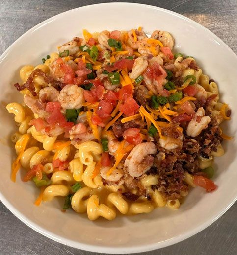 Fresh cooked cavatappi tossed in house-made cheese sauce. Topped with shrimp, langostino, cheddar, tomato, and green onions.