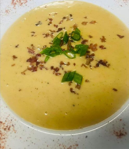 Mashed potatoes, bacon, caramelized onion, cheddar, mozzarella, green onions & sour cream.